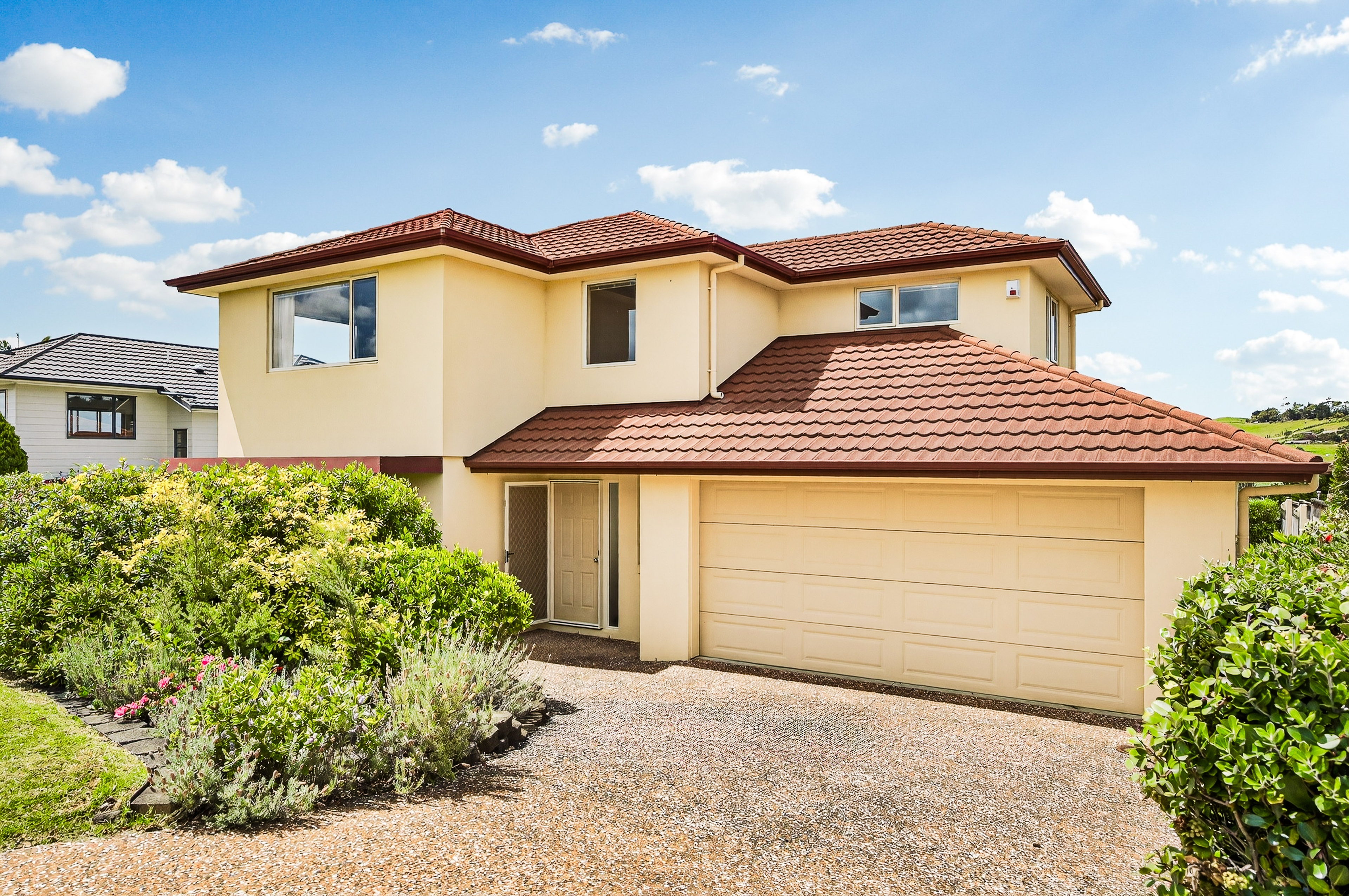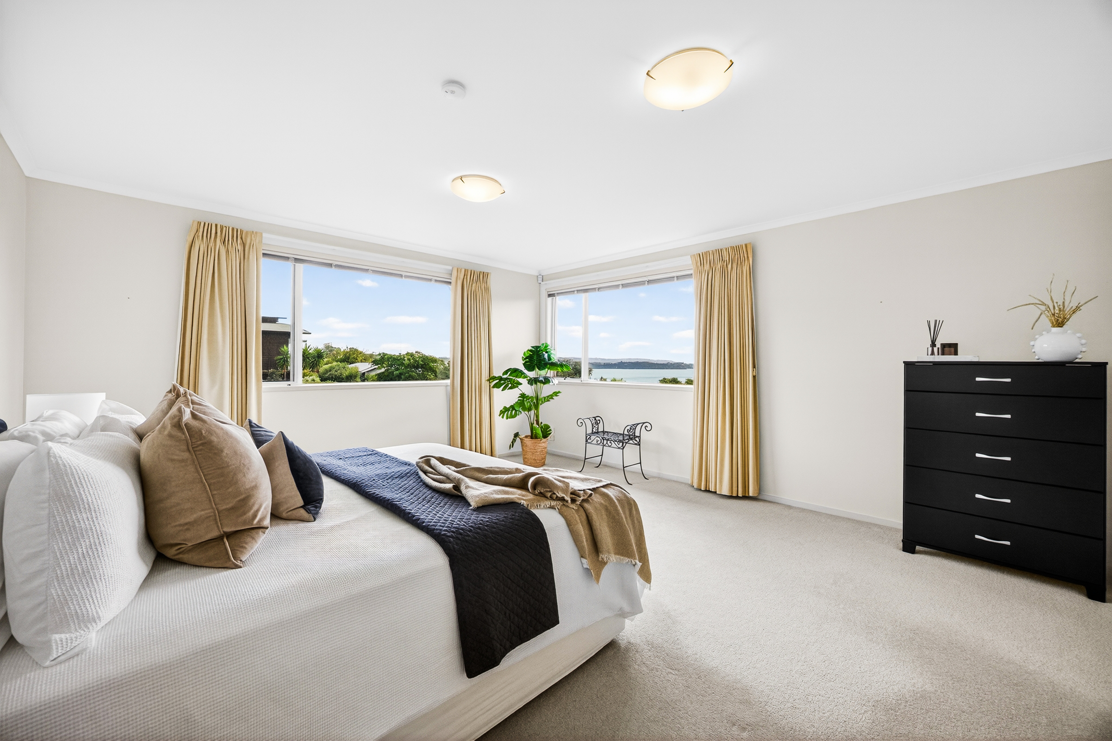 The layout is deliberate and practical. Two separate living areas allow the house to be used in different ways at once, while four bedrooms and two bathrooms are arranged across the levels to provide both separation and flow. Upstairs, the main bedroom looks out toward the bay – a simple reminder of how close the water is to daily life. A double garage sits naturally within the footprint of the home, supporting the way the house is used rather than adding bulk.